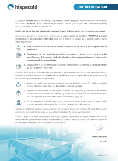 En Hispacold, cada actividad está basada en una sólida cultura de la calidad y en un compromiso real con el medio ambiente y la seguridad y la salud en el trabajo. Las normas internacionales ISO 9001:2005, EN 15085-2, ISO 14001:2015, UNE EN 15085-2 e ISO 45000:2015 (OSHAS) son una clara prueba de esta filosofía de trabajo.